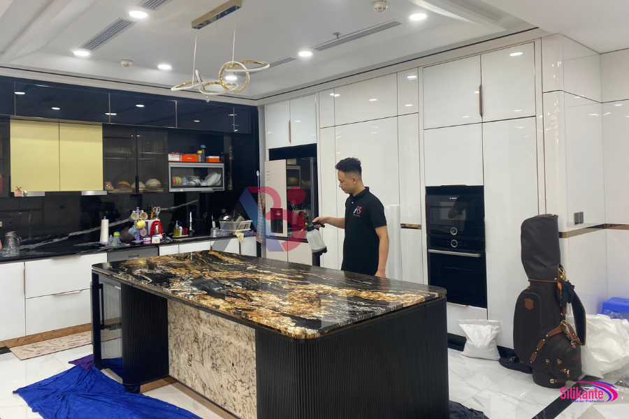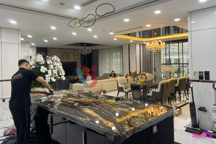 Khoác lên lớp phim bảo vệ Silikante Pro cho bàn ăn đá, bàn đảo đá bếp cho khách hàng tại địa chỉ: T10 Time City Hà Nội.