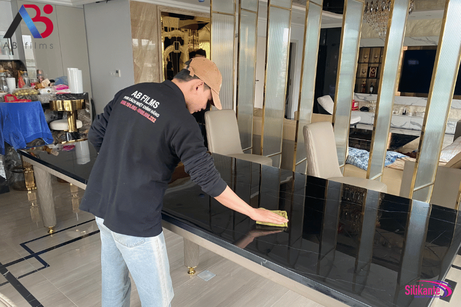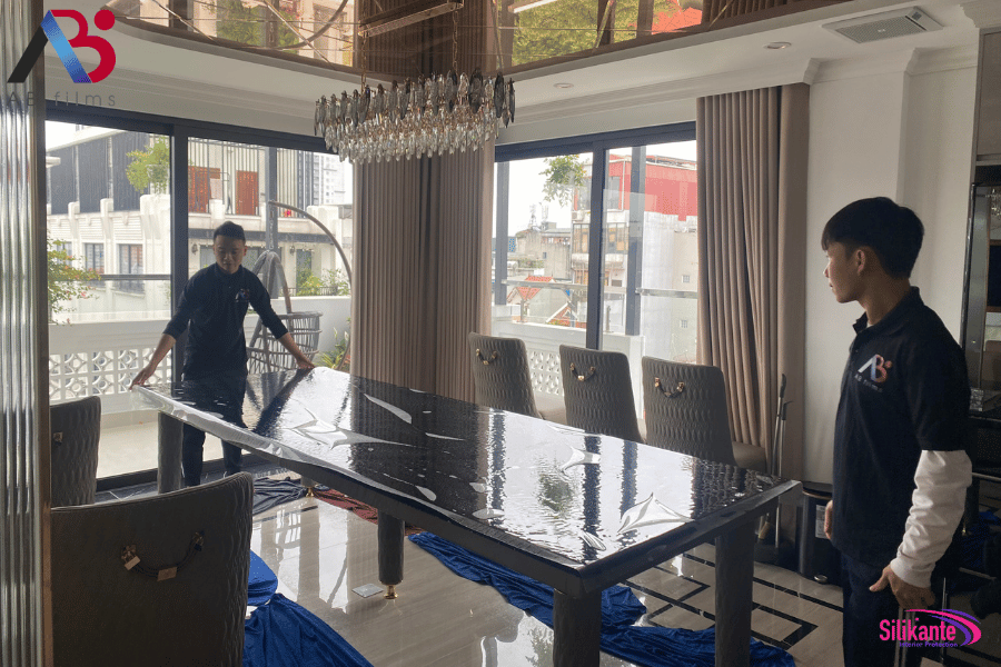 Với những vấn đề như vậy, anh H ở Hoàng Cầu, Hà Nội đã lựa chọn giải pháp dán phim bảo vệ Silikante của công ty AB Films để bảo vệ bề mặt bàn ăn, bàn trà. Anh H chia sẻ sau khi dán, bề mặt trông sáng bóng và đẹp hơn rất nhiều.